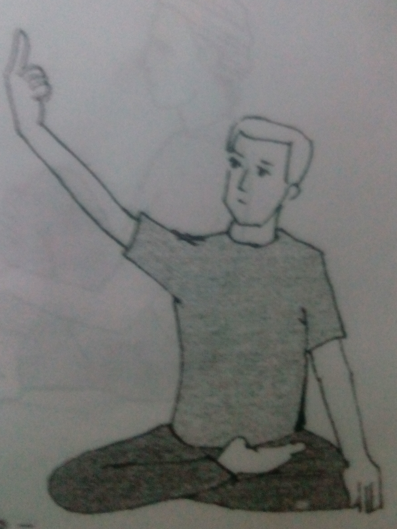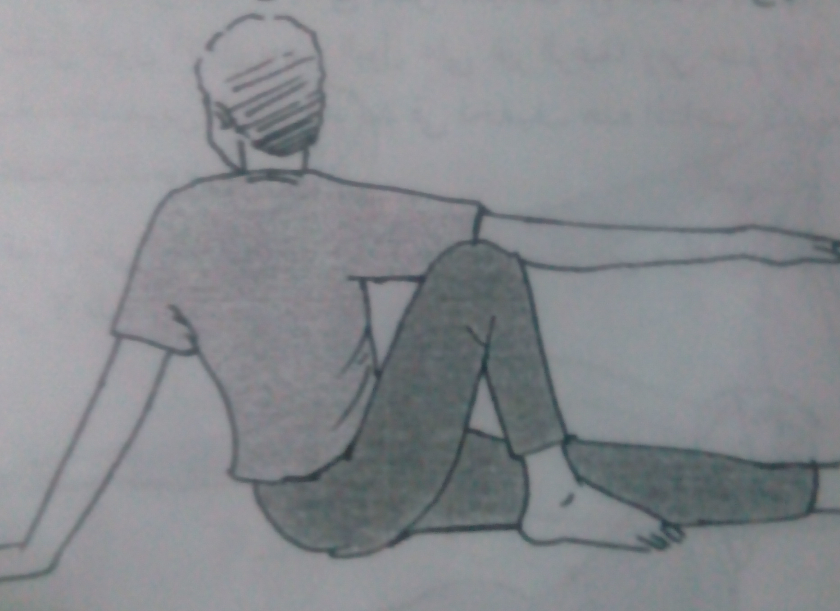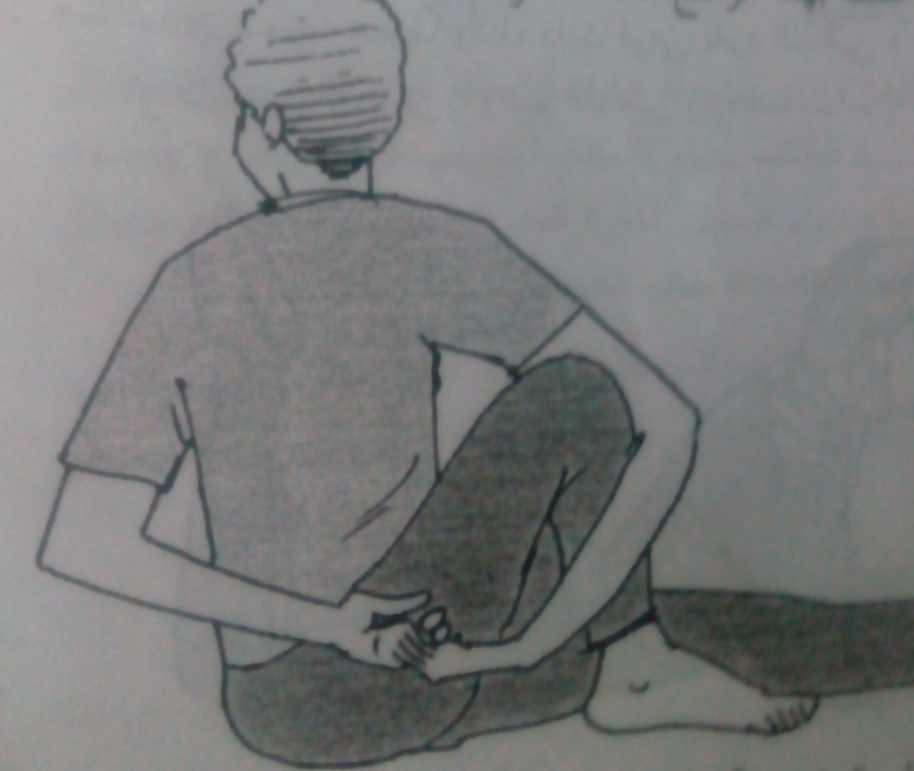 2- تنفس بطريقة عادية .. واستند بيدك اليمنى على الأرض خلف الظهر مع تمديد الذراع اليسرى فوق الركبة اليسرى فى وضع مفرود تماما .