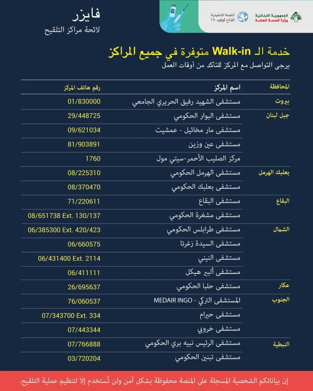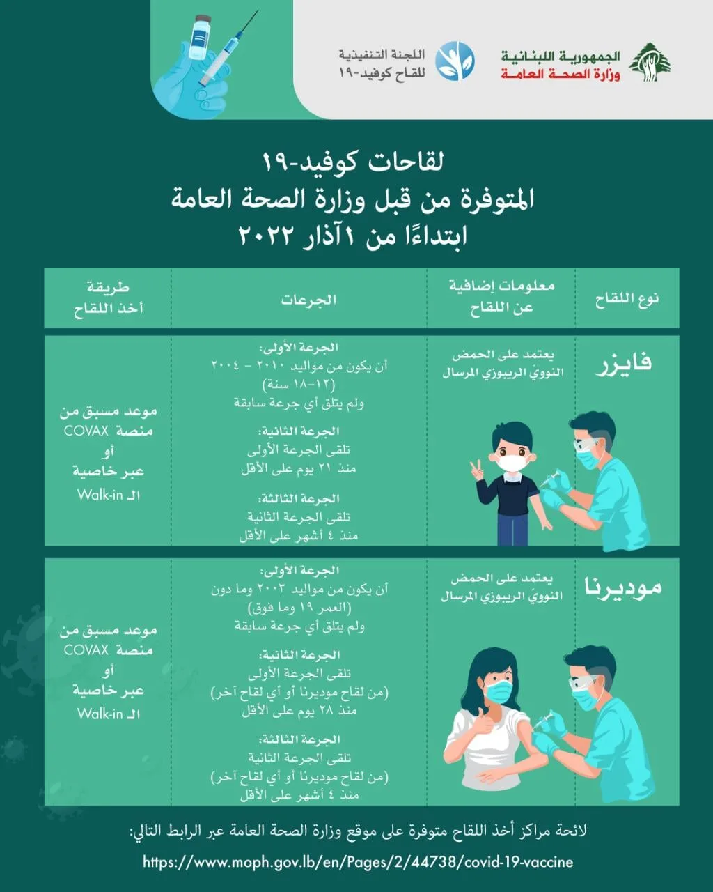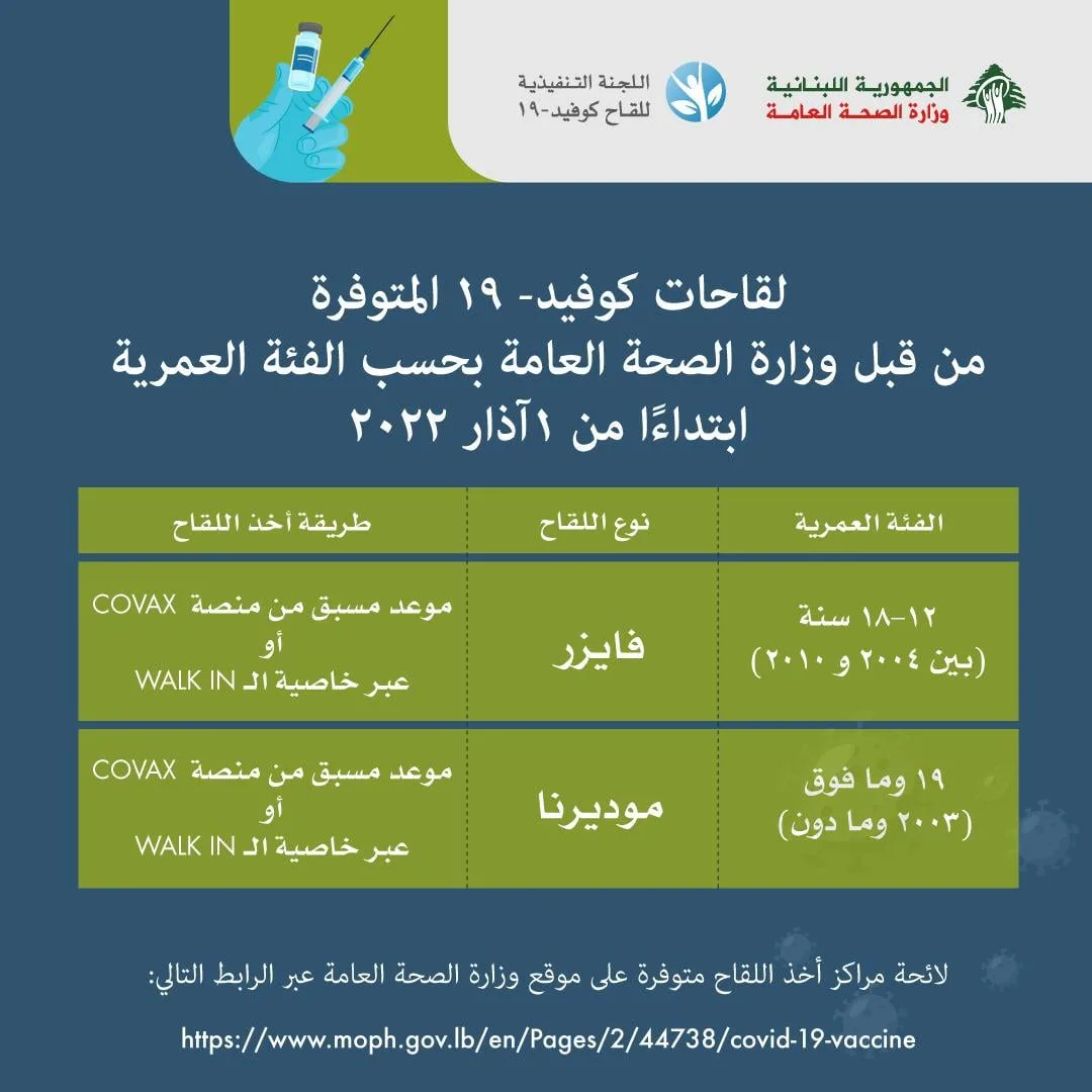 ستبدأ وزارة الصحة العامة، إبتداءً من يوم غد ١ آذار، بإعطاء لقاح فايزر للفئة العمرية بين ١٢-١٨ سنة،