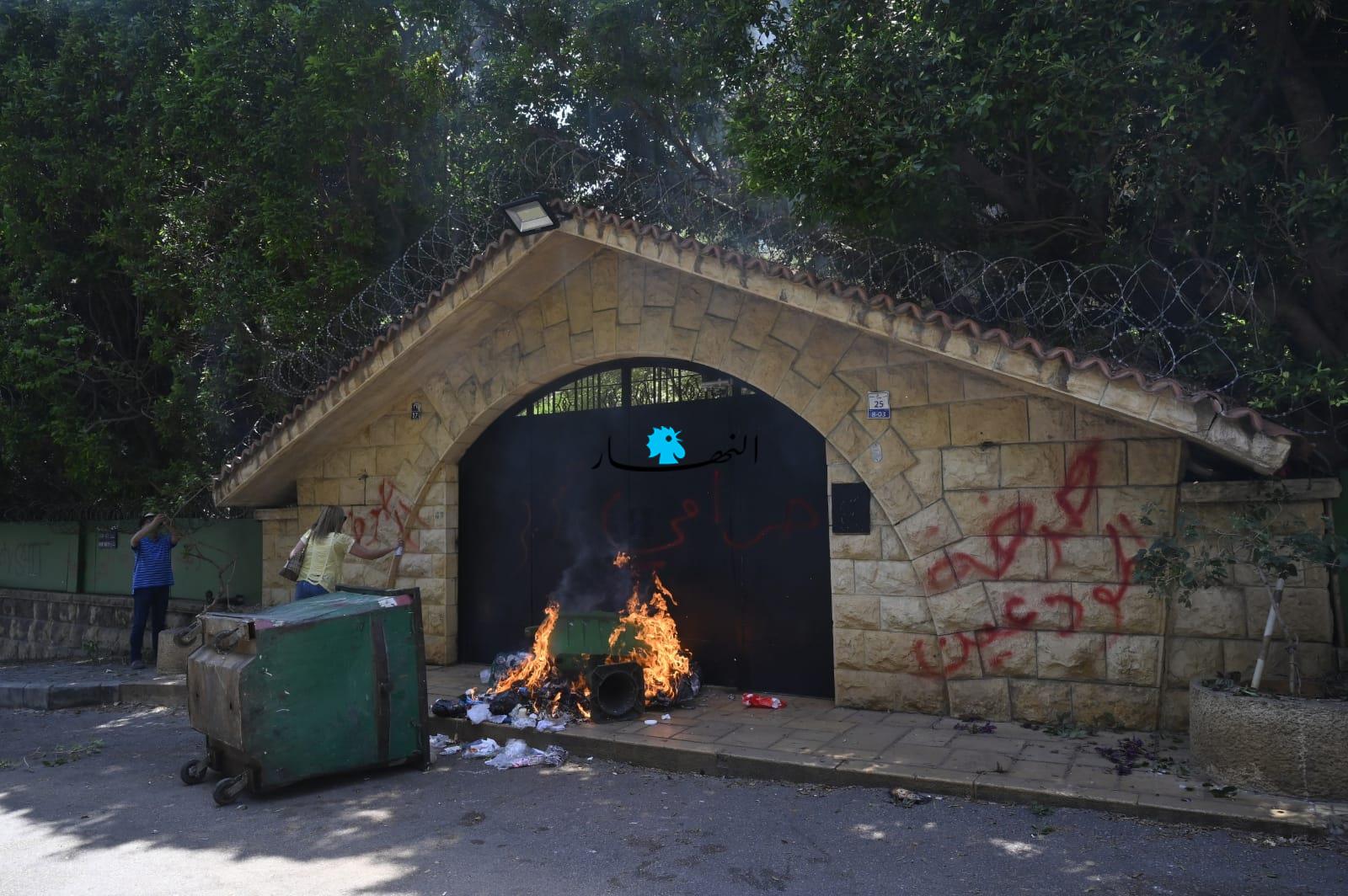 كما أشعل المحتجون النيران في مكب للنفايات عند إحدى مداخل المنزل، ورفعوا شعارات مندّدة بالمصارف.